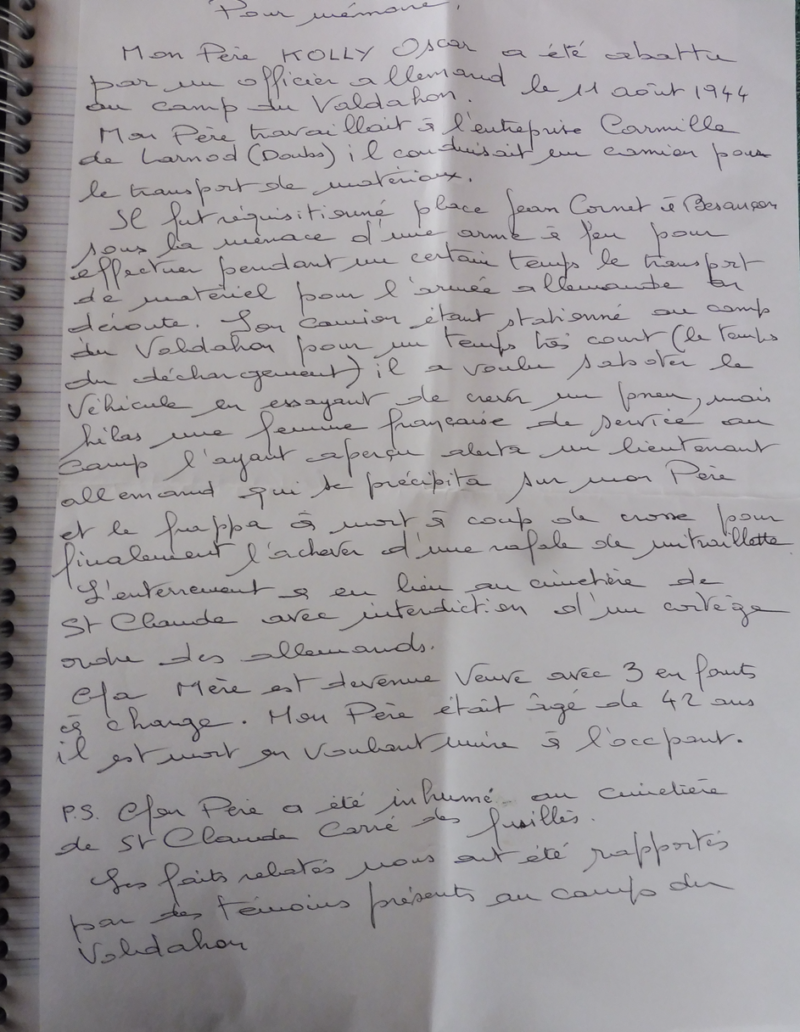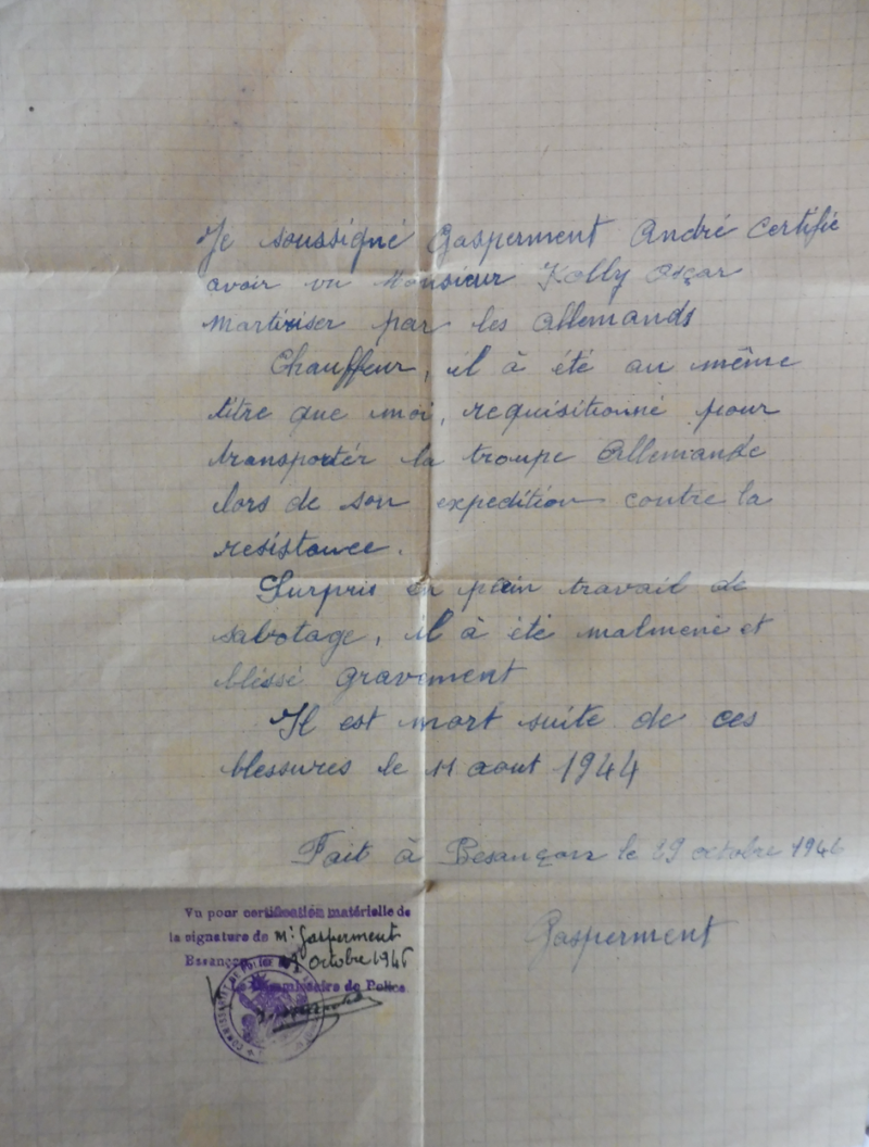 En 1944, Oscar Kolly est chauffeur de camion pour l’entreprise Carmille et fils de Larnod. Il habite alors le quartier des Chaprais, au n° 24 bis rue des Cras.
