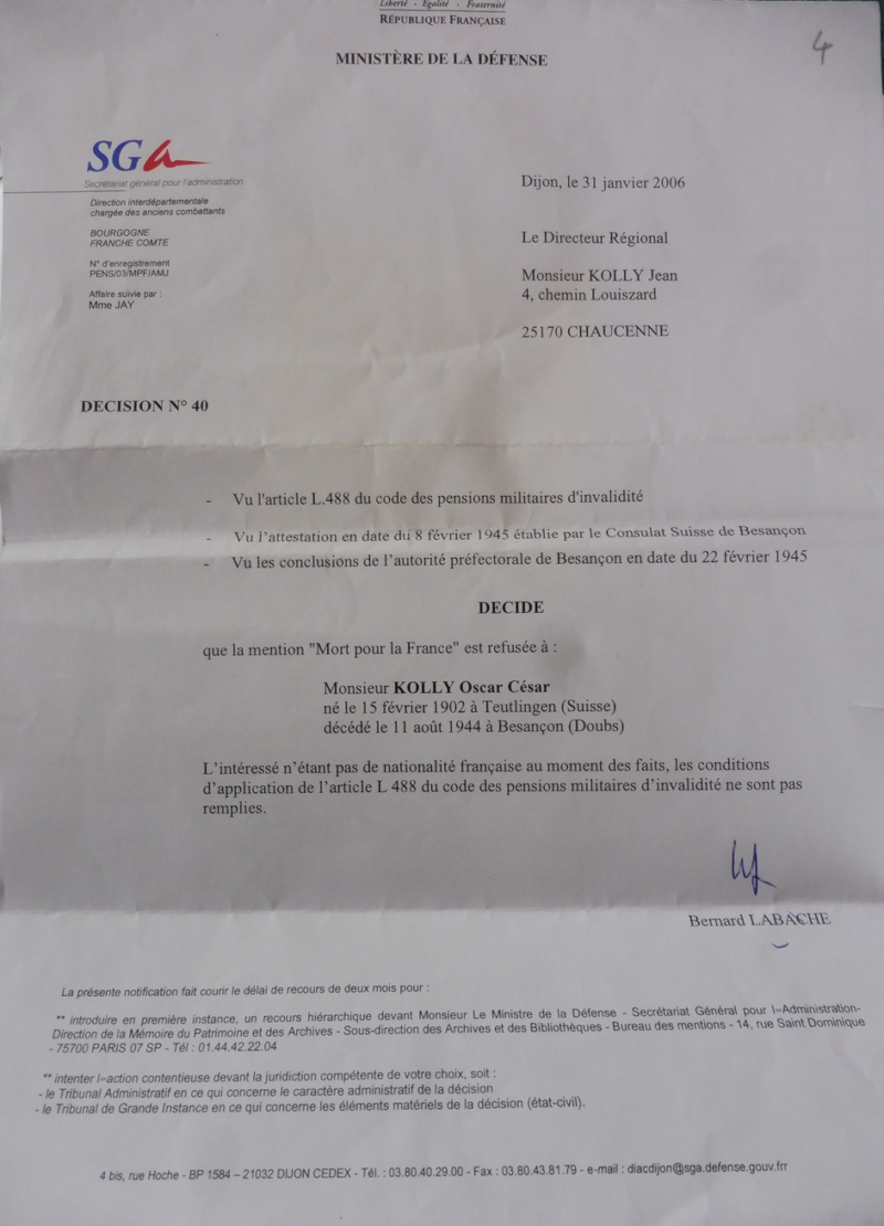 La veuve d’Oscar Kolly entame alors des démarches pour faire reconnaître officiellement que son époux est mort pour la France. Elle n’obtient pas satisfaction, tout juste une petite aide en 1945.