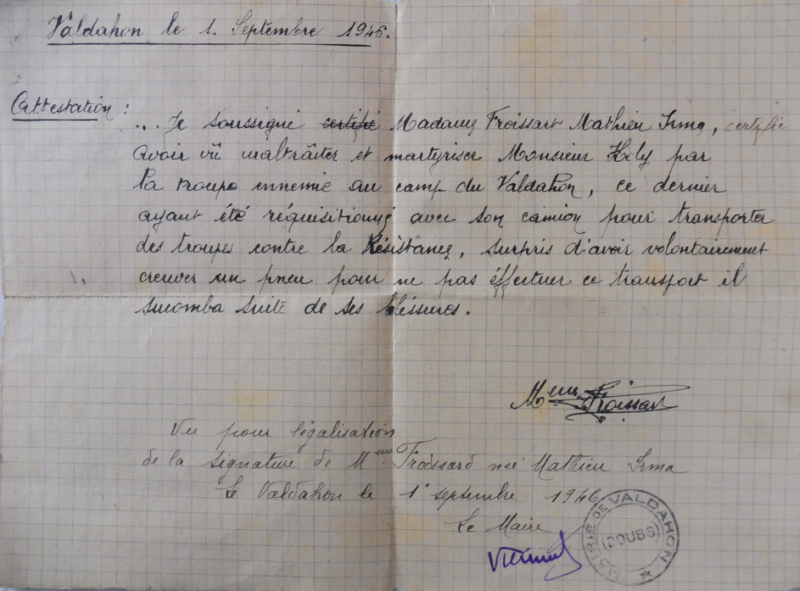 Attestation de Mme Froissart témoin direct des événements au Valdahon