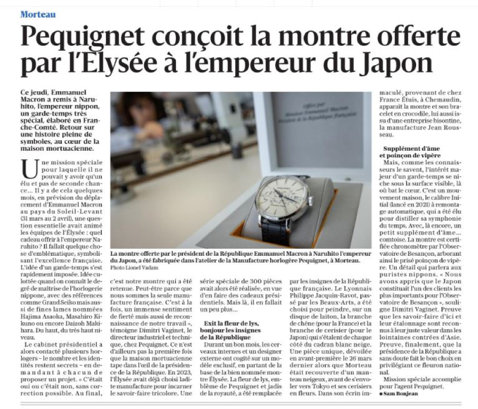 Cocori…quet ! Pratiquement tous les médias évoquent le cadeau de l’Elysée à l’Empereur du Japon : une montre PEQUIGNET, très particulière et unique, offerte par le Président de la République E. Macron, à l’empereur du Japon…