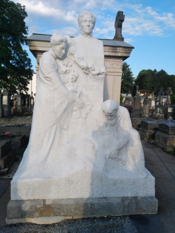 Au cours de cette visite, à la limite de la partie nord la plus ancienne et la partie sud plus récente, un monument imposant, d’un blanc éclatant, attire tous les regards. Nous le commentons alors brièvement : ce monument funéraire a été réalisé par le sculpteur Albert Pasche, pour sa famille. Nous connaissons sa date de naissance (1873) mais pas encore la date de son décès (1964). Nous indiquons quelques unes de réalisations en ville : des pierres taillées de la fontaine place Jean Cornet alors qu’il n’a que 15 ans, un poilu du monument aux morts de la guerre 14/18, etc.