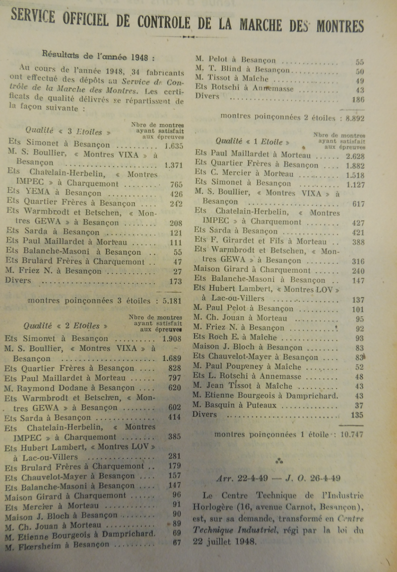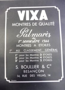 Ce classement de 1948 réalisé par le CETEHOR démontre que 2 860 montres VIXA de S. Boullier sont certifiées 3 ou 2 étoiles sur un total de 14 073 montres présentées par 34 fabricants