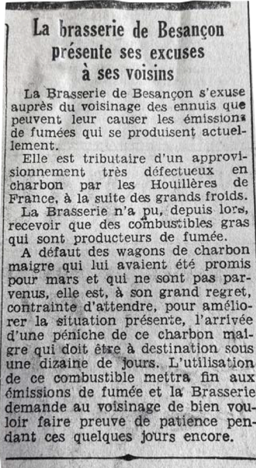 En 1960, devant une énième fronde des riverains et de réclamations du bureau d’hygiène de la ville, la brasserie tente encore de désamorcer les contestations. Elle fait paraître un article dans les colonnes du journal local où elle s’excuse encore une fois platement.