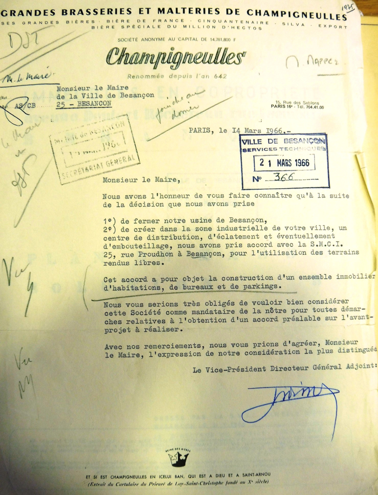 Le 21 mars de la même année, la société lorraine Champigneulles, désormais propriétaire de la brasserie, écrit au maire de Besançon pour l’informer qu’elle ferme son usine de la Mouillère pour la remplacer par un simple centre de distribution en zone industrielle.