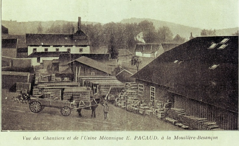 Émile Pacaud installe son usine mécanique de briques au début du XXe siècle contre le flanc droit du moulin. Elle produit des plots de construction à base de scorie comprimée. Sur l’illustration, on distingue le toit du moulin à droite et une partie de la brasserie en arrière plan.