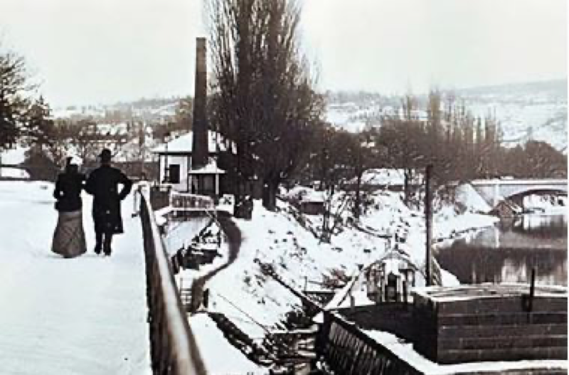 Elle fait mouvoir un beau moulin à blé, un lavoir, une scierie, un moulin à moutarde et arrose un bassin embelli par une brasserie considérable et par plusieurs maisons et jardins de restaurateurs, très fréquentés ».