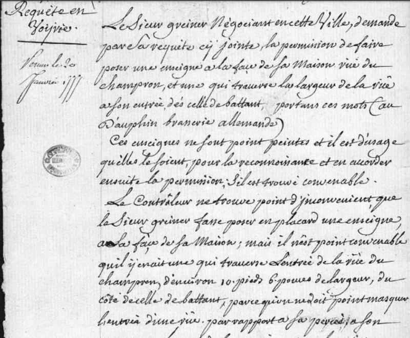 Requête de Greiner pour pose d’une enseigne 1777 archives municipales